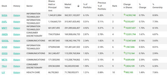 其中,英伟达以超6%的组合权重络续独占鳌头,握股超19亿股,季末握仓市值约3625亿好意思元,较上季度比拟增多约1455万股。苹果、微软分列二、三位,季末握仓市值远离约3139亿好意思元和2910亿好意思元。