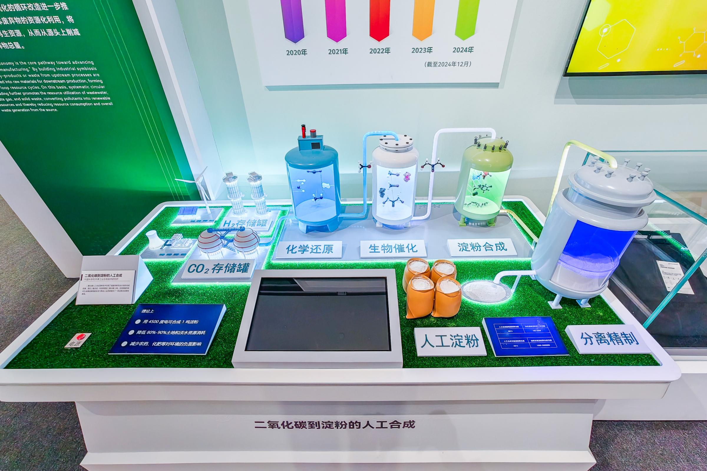 高技术现实仪器旁堆放着“食粮袋子”,这个新奇组合展现着从二氧化碳到淀粉的东谈主工合成时刻,这项时刻收尾了杰出传统农业8.5倍的合见效果。